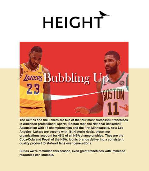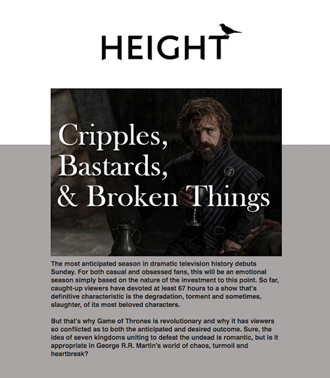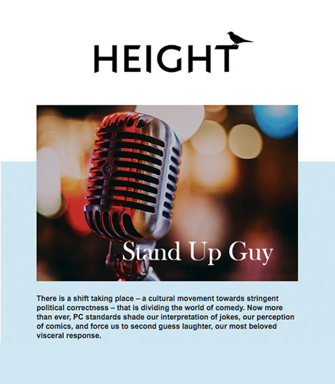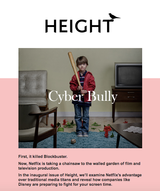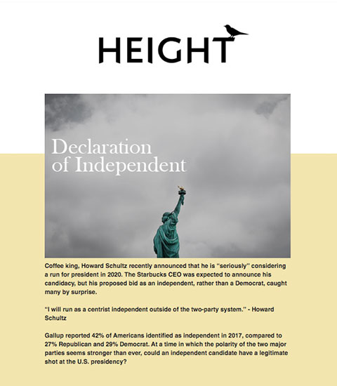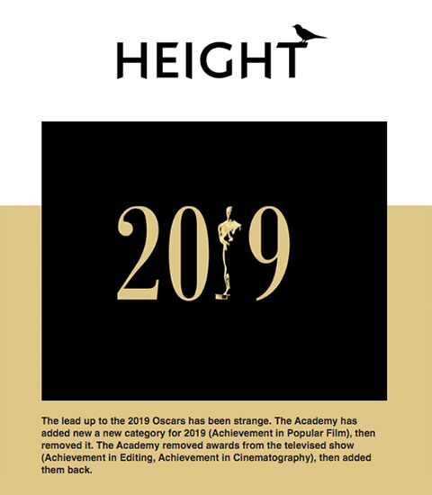 In January of 2019, I launched a project called “Height,” a 10-part email series covering American media, politics, pop-culture, sports and more. The goal of Height was to explore perspectives on 10 media events/trends. Each email contained a written essay along with bonus content, including music, film and television recommendations.